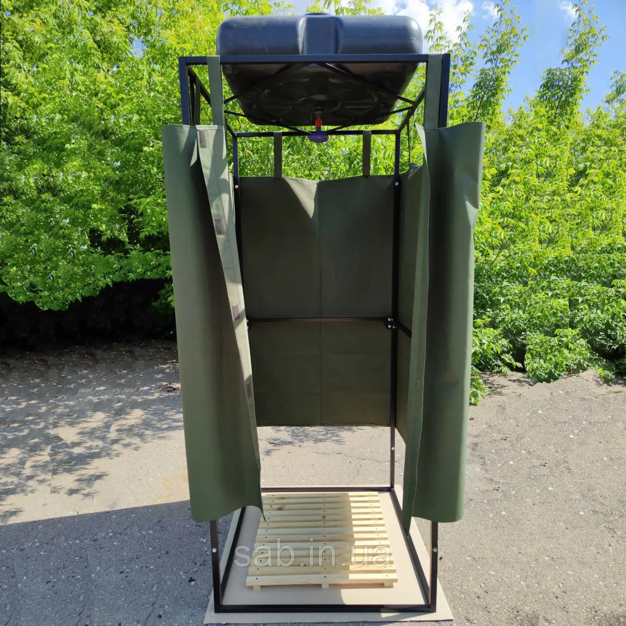 Каркас разборного душа изготавливается из высококачественной стали толщиной от 2.5 миллиметров. Таким образом, душ для дачи может выдержать нагрузку от бака до 400 литров.