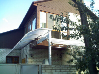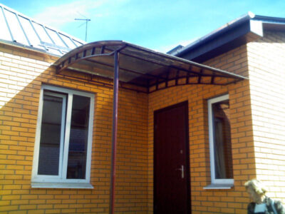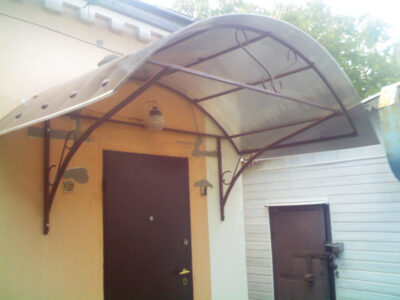 • В случае, если на входе присутствует крыльцо, то над ним можно установить большой козырек, а если площадь мала по своим размерам – наши специалисты готовы выполнить миниатюрную конструкцию, отличающуюся изящностью и компактностью, но в то же время защищающую порог от дождя и снега;