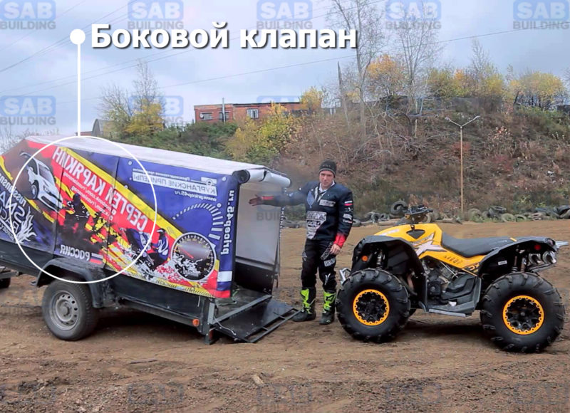 - Сбоку тента располагается еще один клапан, с помощью которого водитель может покинуть прицеп после погрузки квадроцикла (используется не во всех прицепах)