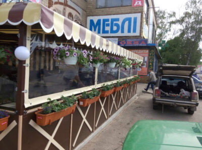 Летний дождь или ветер не помешает приятно покушать и отдохнуть на свежем воздухе.