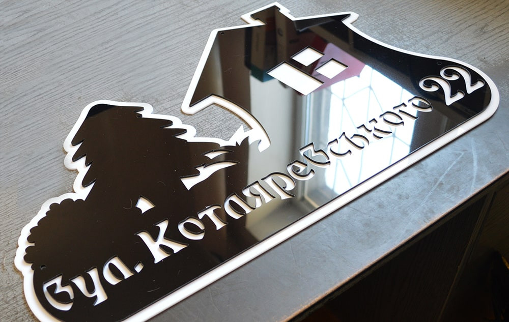 Табличка из пластика относится к премиум сегменту. Дело в том, что мы используем не обычный пластмасс, а высококачественный акриловый пластик и сама табличка собирается из двух элементов. Один элемент содержит узоры и вырезанный текст, а другой выступает в качестве подложки и повторяет контур первого элемента с отступом на 1 сантиметр. Оба элемента разного цвета. В зависимости от оформления вашего дома, передняя часть может быть черная, а подложка белая или наоборот.