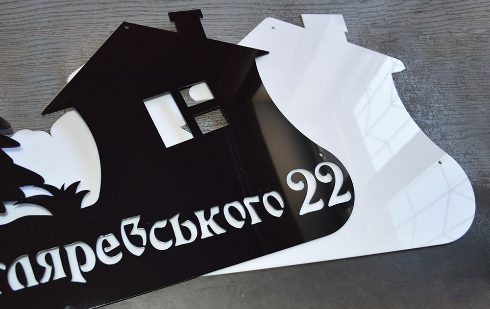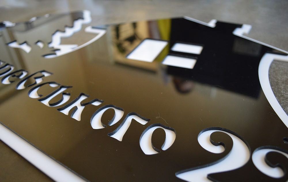 Благодаря лазерному лучу удается делать разрезы толщиной 0.3 мм. Что дает возможность вырезать максимально детализированную табличку. Все макеты в нашем каталоге можно изготовить из перечисленного выше материала. С помощю лазера на табличках так же вырезаются отверстия для крепления. В случаи с пластиковой табличкой, где используется два слоя, отверстия у основы и подложки совпадают. Отверстия на всех табличках имеют пятимиллиметровый диаметр.